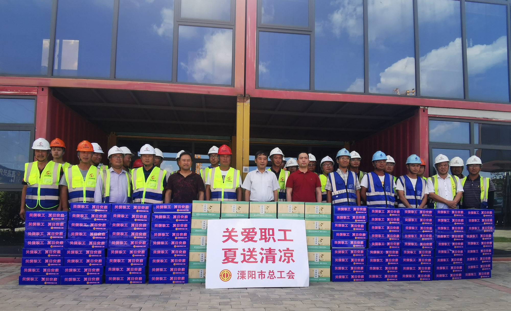 7月23日下午,正值盛夏時節(jié),酷暑當(dāng)頭,驕陽似火,溧陽市總工會萬如才主任、秦益明部長等一行數(shù)人,走訪慰問了我司創(chuàng)優(yōu)立功重點項目—南航二期三標(biāo)段項目部,開展“夏送清涼、關(guān)愛民工”慰問活動,向奮斗在高溫一線的建筑工人送上總工會的關(guān)愛,并送上一百多箱水果和礦泉水。集團(tuán)總裁周瑜陪同接待。